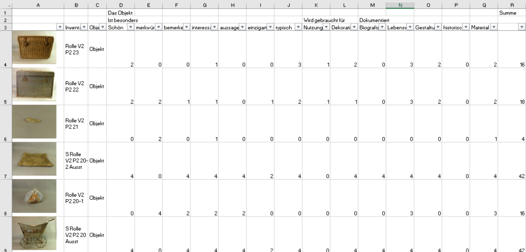 In einer Tabelle habe ich den einzelnen Objekten auf diese Weise die jeweiligen Bewertungen zugeordnet. Das Ergebnis sieht so aus: