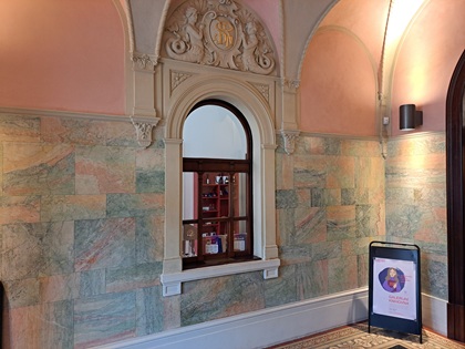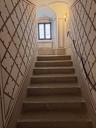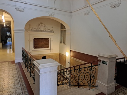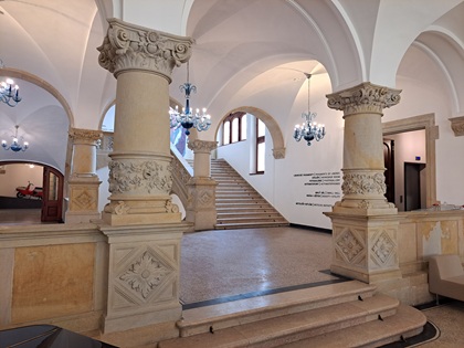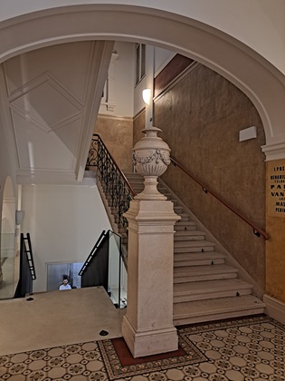 Im Inneren zeichnet es sich architektonisch durch ein monumentales Treppenhaus: