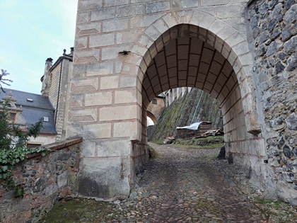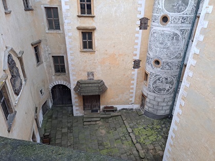 Zu Füßen der Burg gruppieren sich zwei Schlossflügel um einen großen Hof: