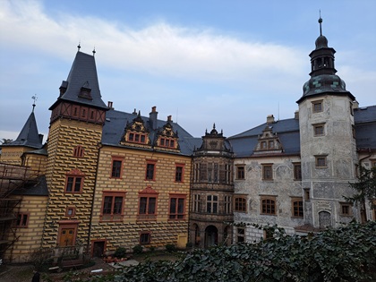 Das vierte Exkursionsziel war das Schloss Friedland. Dieses hat historische Bedeutung insbesondere dadurch erlangt, dass es während des Dreißigjährigen Krieges einige Zeit lang Albrecht von Wallenstein gehörte, der von diesem ausgehend als Herzog von Friedland sein Herrschaftsgebiet bildete. Nach seiner Ermordung wurde es der Familie Gallas übertragen und ging im 18. Jahrhundert an deren Nachfolger, die Familie Clam-Gallas, über. Diese richtete bereits Anfang des 19. Jahrhunderts in der den Kern der Schlossanlage bildenden Burg ein Museum ein. Die letzte Vertreterin dieser Familie musste das Schloss im Zuge der Vertreibungen Mitte des 20. Jahrhunderts (die entgegen einem verbreiteten Irrtum nicht einfach 1945 stattfanden sondern in tschechischen Gebieten bereits 1938 einsetzten, im Deutschen Reich sogar schon 1933) verlassen. Es wurde daraufhin unmittelbar vom tschechoslowakischen Staat übernommen und als Schlossmuseum betrieben.